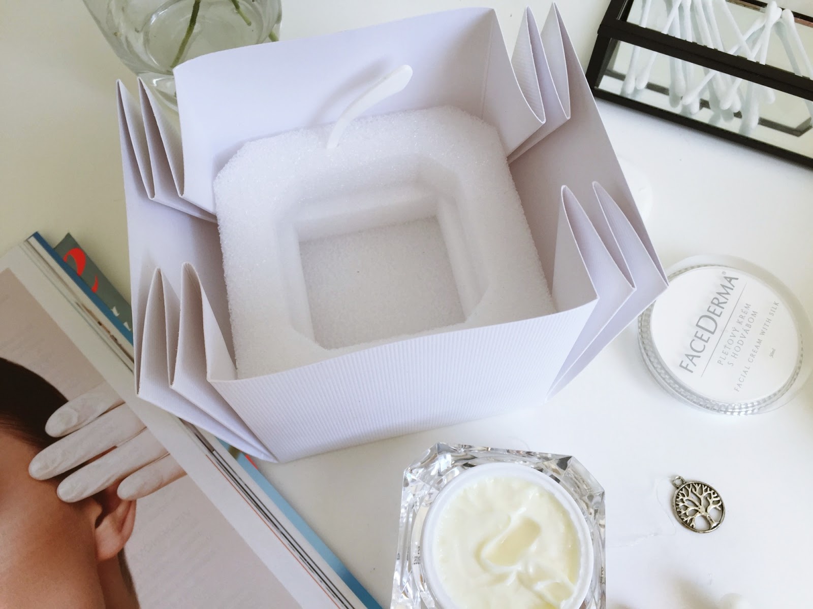 Krém sa vzhľadom na veľkosť produktu predáva v dosť veľkej bielej "krabičke". Kedže som v obchode videla tester, ktorý nemal rovné dno, ale bol neprakticky v tvare "diamantu", trochu som sa obávala, že aj tento krém bude mať presne také isté línie. Našťastie ide o bežné plastové balenie, vďaka čomu je vcelku ľahké. Na jednej strane sa mi páči myšlienka luxusného "diamantového" tvaru. Na druhej strane si nemôžem si pomôcť, ten plast a popis na mňa pôsobí príliš minimalisticky a lacno. Ale, čo tam po tom, keď obsah bude plniť svoju funkciu, však?!
